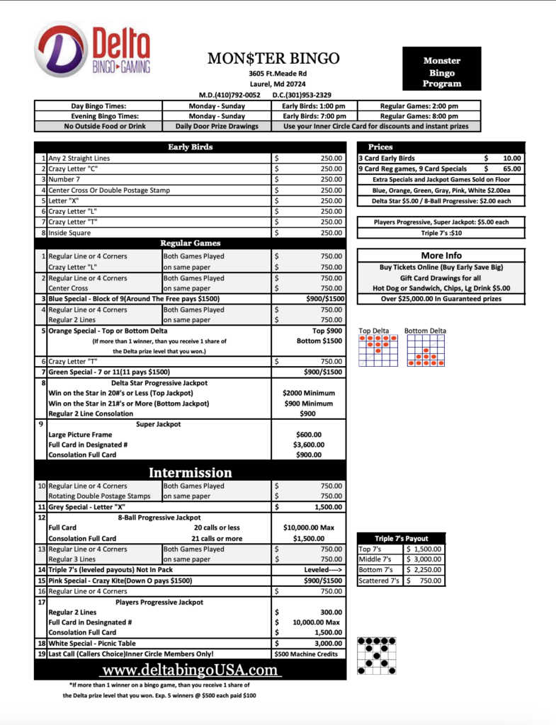 Saturday, April 4th at 1pm, Delta Bingo & Gaming will be hosting “Monster Bingo” at our Laurel Location. The first 150 tickets will be sold at a discounted price, once those are sold out ticket sales will be purchased at normal pricing. Be sure to purchase your discounted tickets before they are sold out. Admission includes 9 card regular games, & 9 card specials, all other specials, and jackpot games will be sold the day of on the floor.